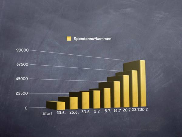 Auf dieser Seite werden Sie über die Spenden-Entwicklung informiert. Der aktuelle Kontostand: Stand 30. Juli 2010 80.073,13 Euro = 1601 Typisierungen Die Initiativgruppe freut sich, eine Woche nach der Typisierungsaktion, diesen Spendenstand mitteilen zu können. Es haben sich 1256 Personen typisieren lassen. Für weitere Aktionen können zusätzlich 307 Personen typisiert werden. Wir sind von dem Ergebnis und der Resonanz überwältigt und können uns bei allen Mitwirkenden ganz herzlich bedanken. Ein besonderes Dankeschön gilt allen Spendern. Jeder Einzelne zählt!